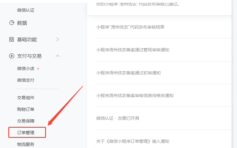 并在在小程序后臺(tái)收到了消息:《微信小程序訂單管理》接入通知。如下圖所示