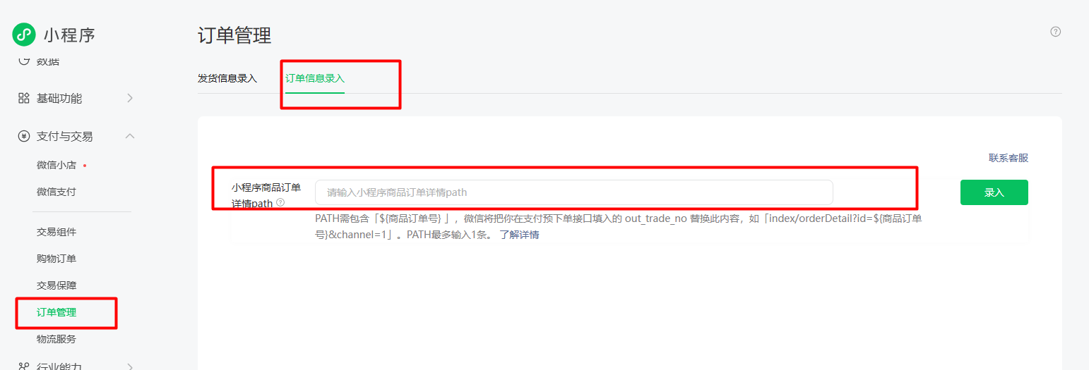 需要在【微信公眾號(hào)平臺(tái)】--【支付與交易】--【訂單管理】-- 【訂單信息錄入】中配置訂單詳情path: