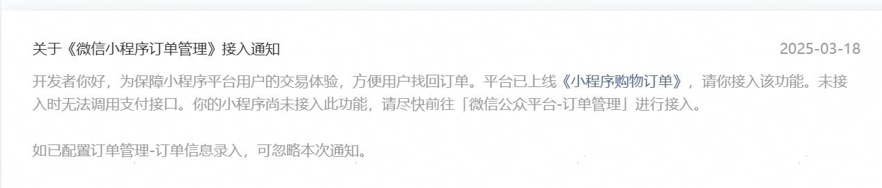 根據(jù)微信平臺(tái)的最新要求,涉及交易類目的小程序必須接入《小程序購(gòu)物訂單》功能才能正常使用支付接口。您遇到的支付權(quán)限限制正是由于未完成該功能的接入所致。